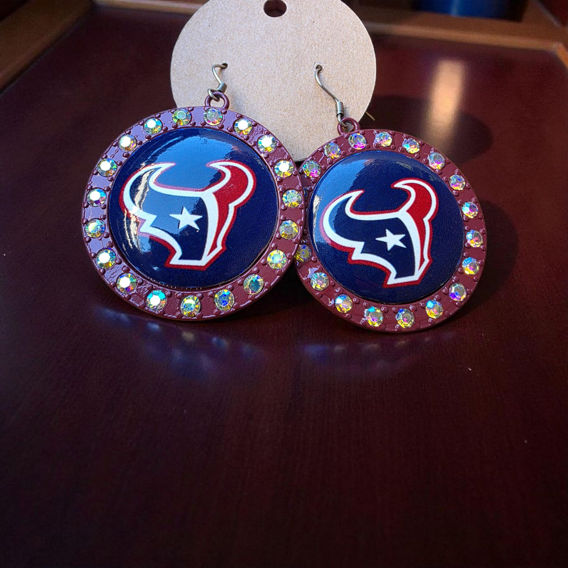 Show up on game day in full sparkle mode! These stunning round earrings feature a bold red, white, and blue design surrounded by iridescent rhinestones for the perfect touch of glam. Lightweight and eye-catching, they’re the ultimate accessory for football season, tailgates, or cheering on your favorite team!