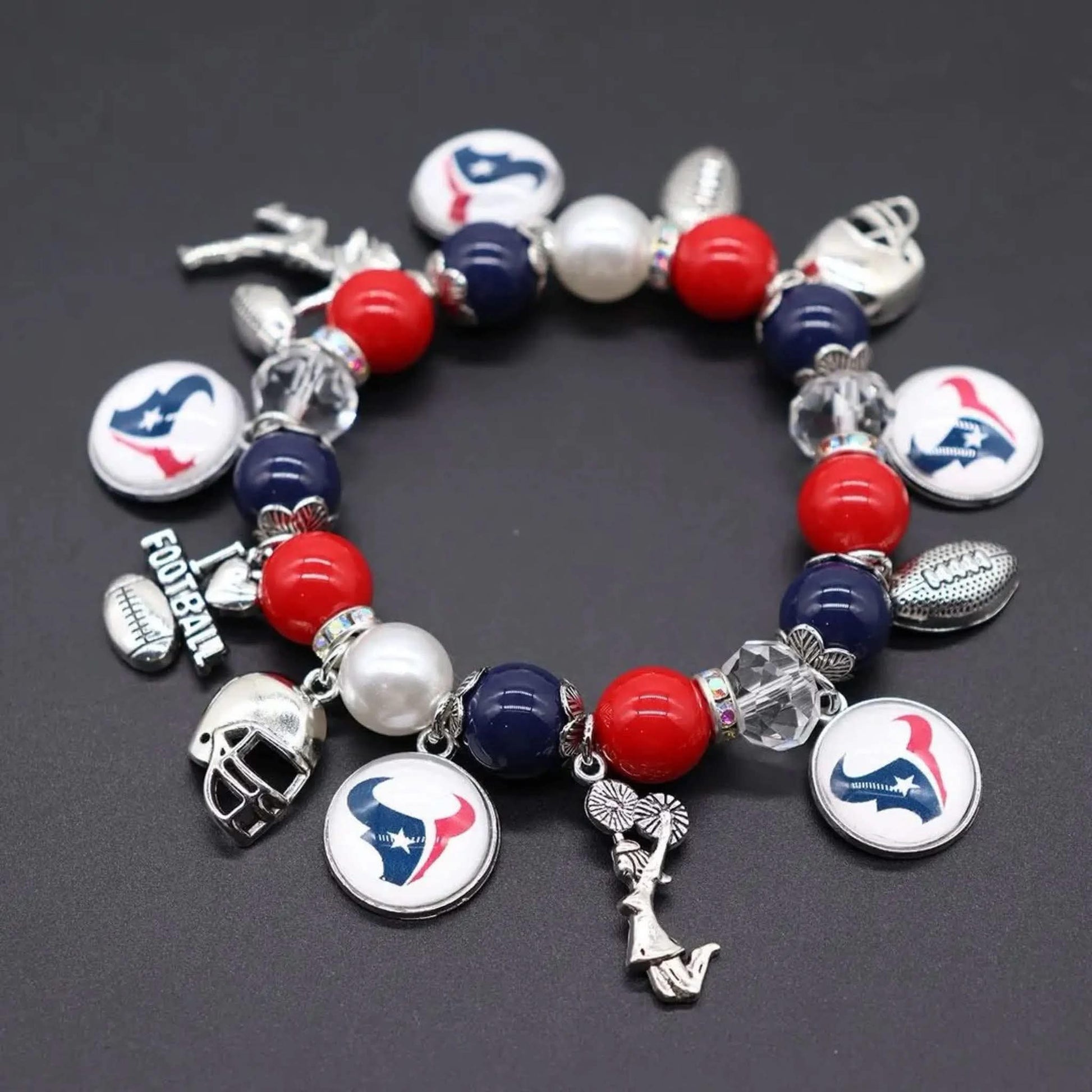 Texans Football Charm Bracelet – Red, White & Blue Beaded Stretch Bracelet