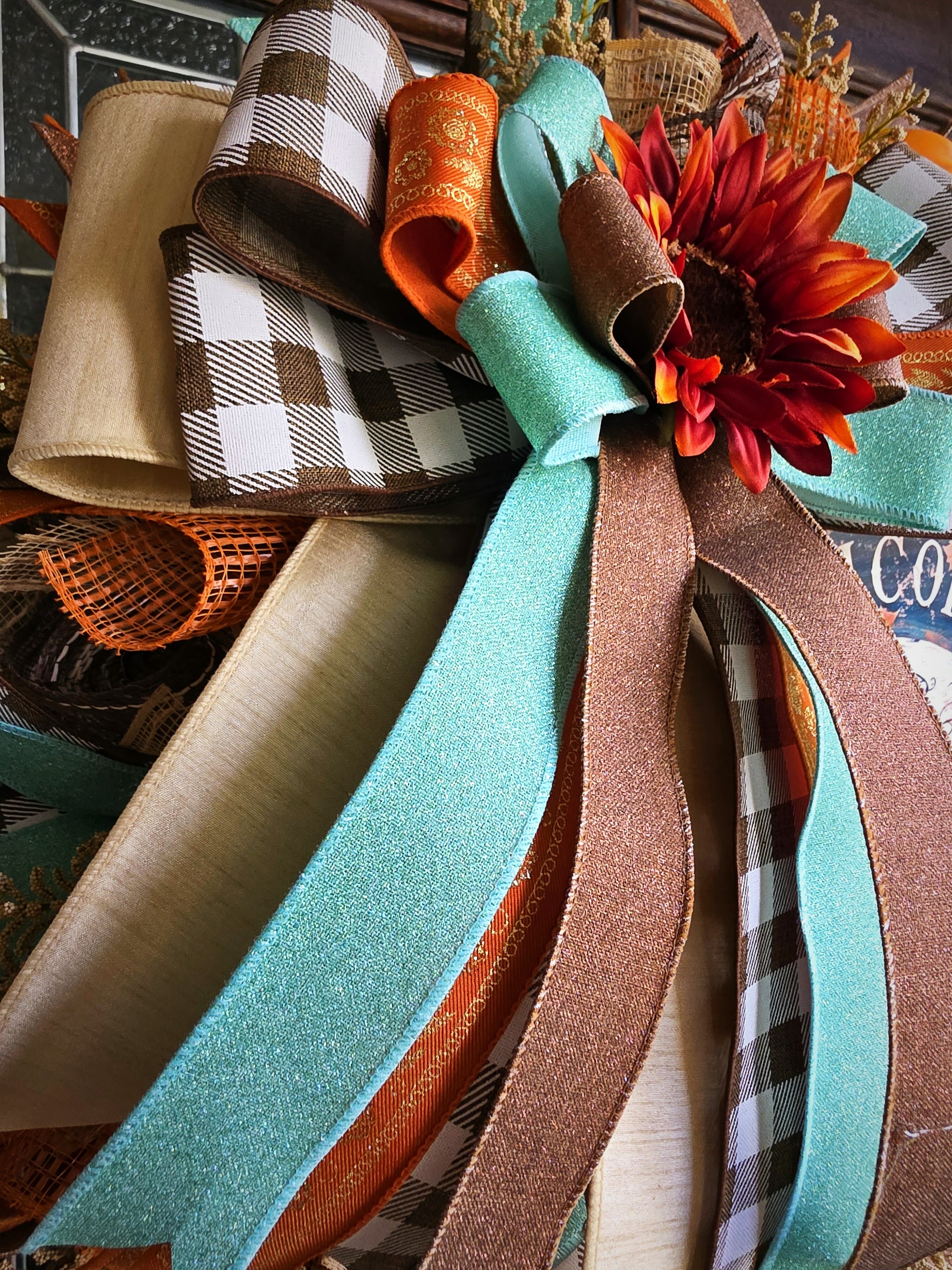 Mix of designer ribbons in teal, bronze, plaid, and pumpkin tones